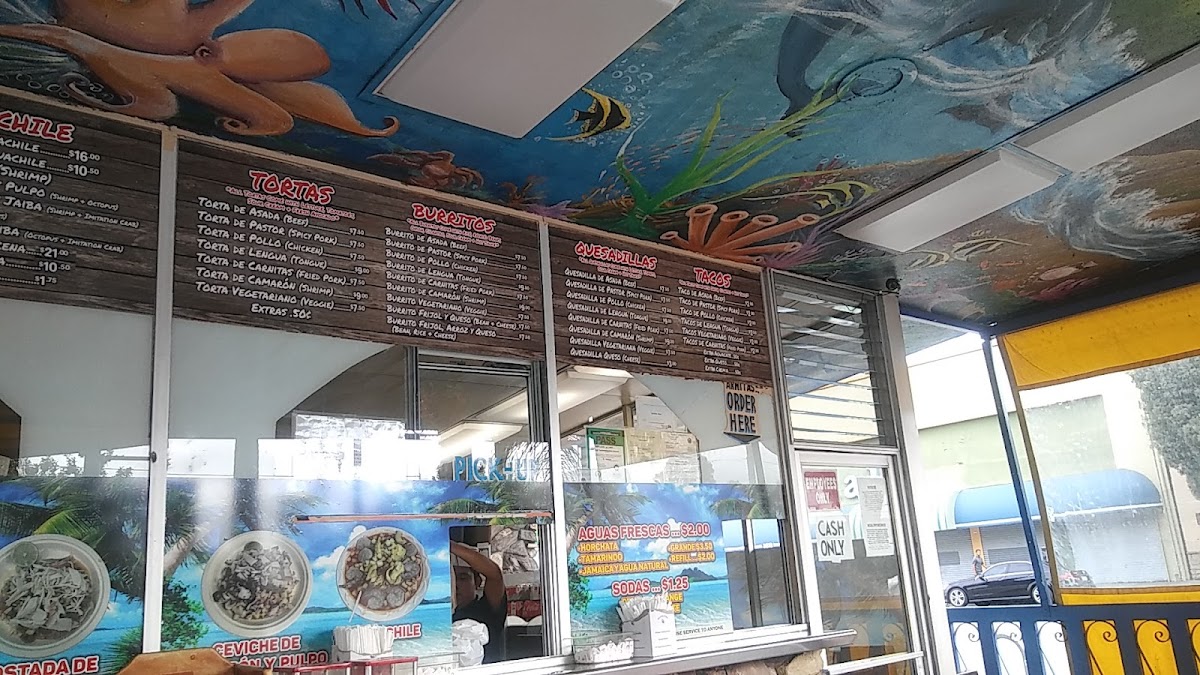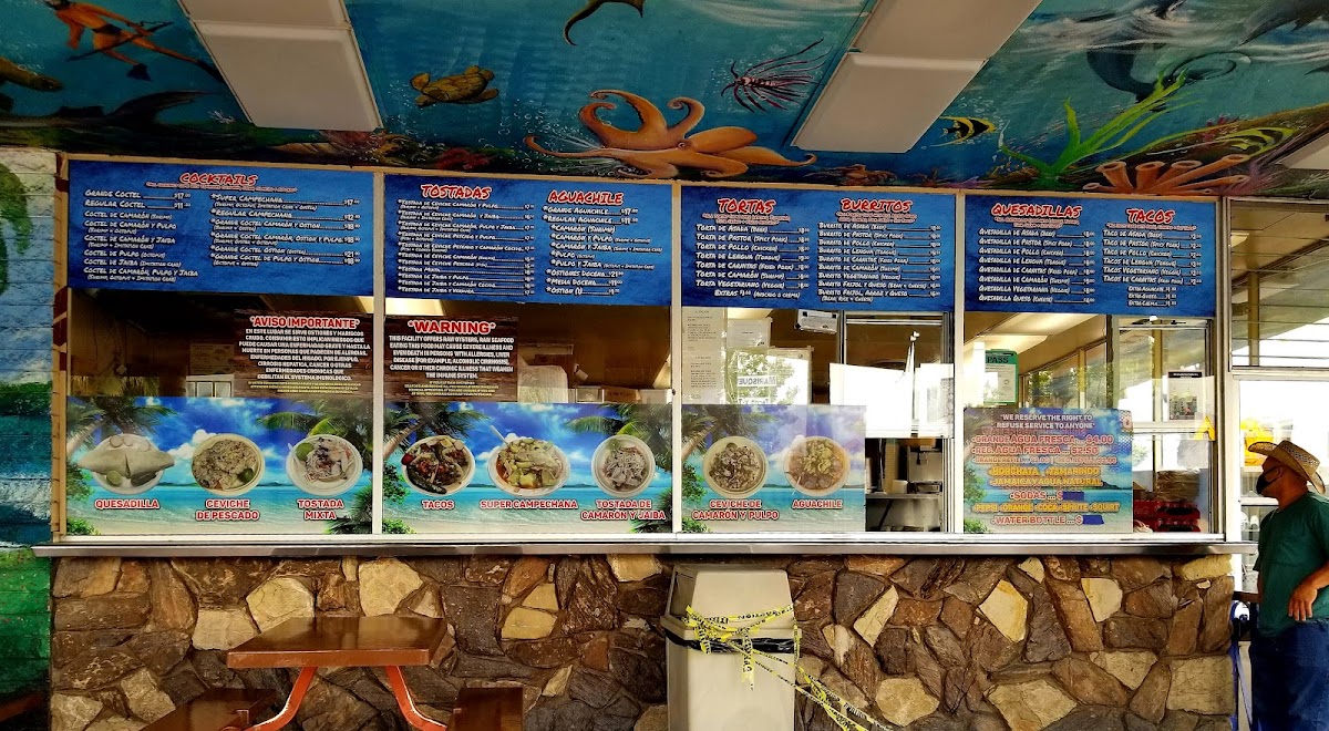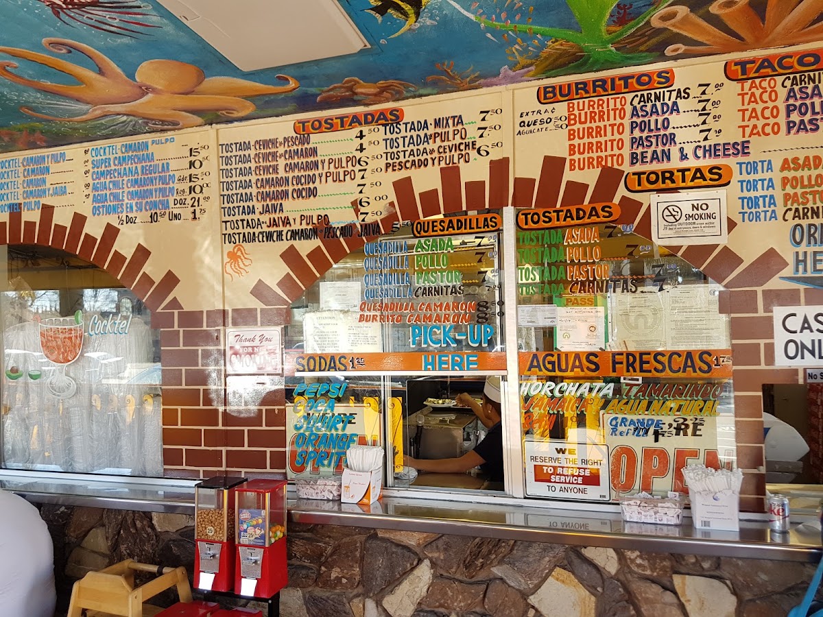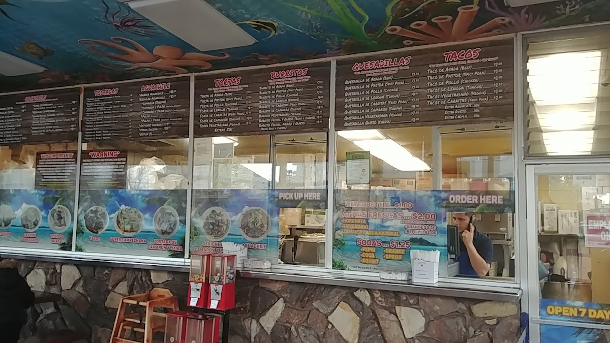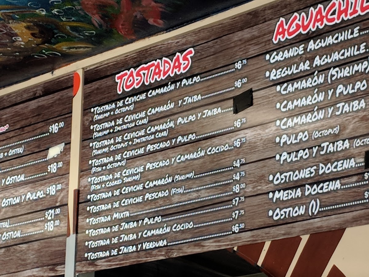 The menu offers a variety of seafood dishes alongside traditional Mexican fast food options, suited for casual dining or quick meals. It includes a selection of tostadas featuring combinations such as shrimp, fish, crab, and octopus ceviches. These are served individually or mixed, providing different seafood flavors on a crisp base.
